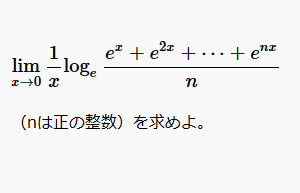 \(\displaystyle \lim_{x \rightarrow 0} \frac{1}{x} \log_e{\frac{e^x+e^{2x}+\cdots+e^{nx}}{n}}\)